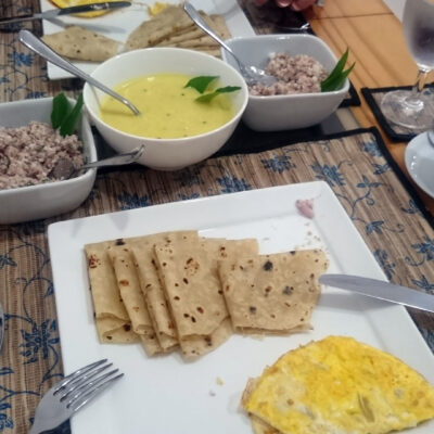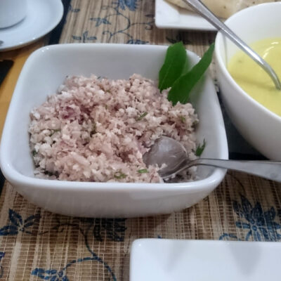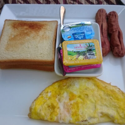 На завтрак давали омлет, традиционное мальдивское блюдо для завтрака – тунец с кокосом, карри (было двух видов с овощами – как рагу и без – как соус) и лепешки – что-то вроде тонкого лаваша.